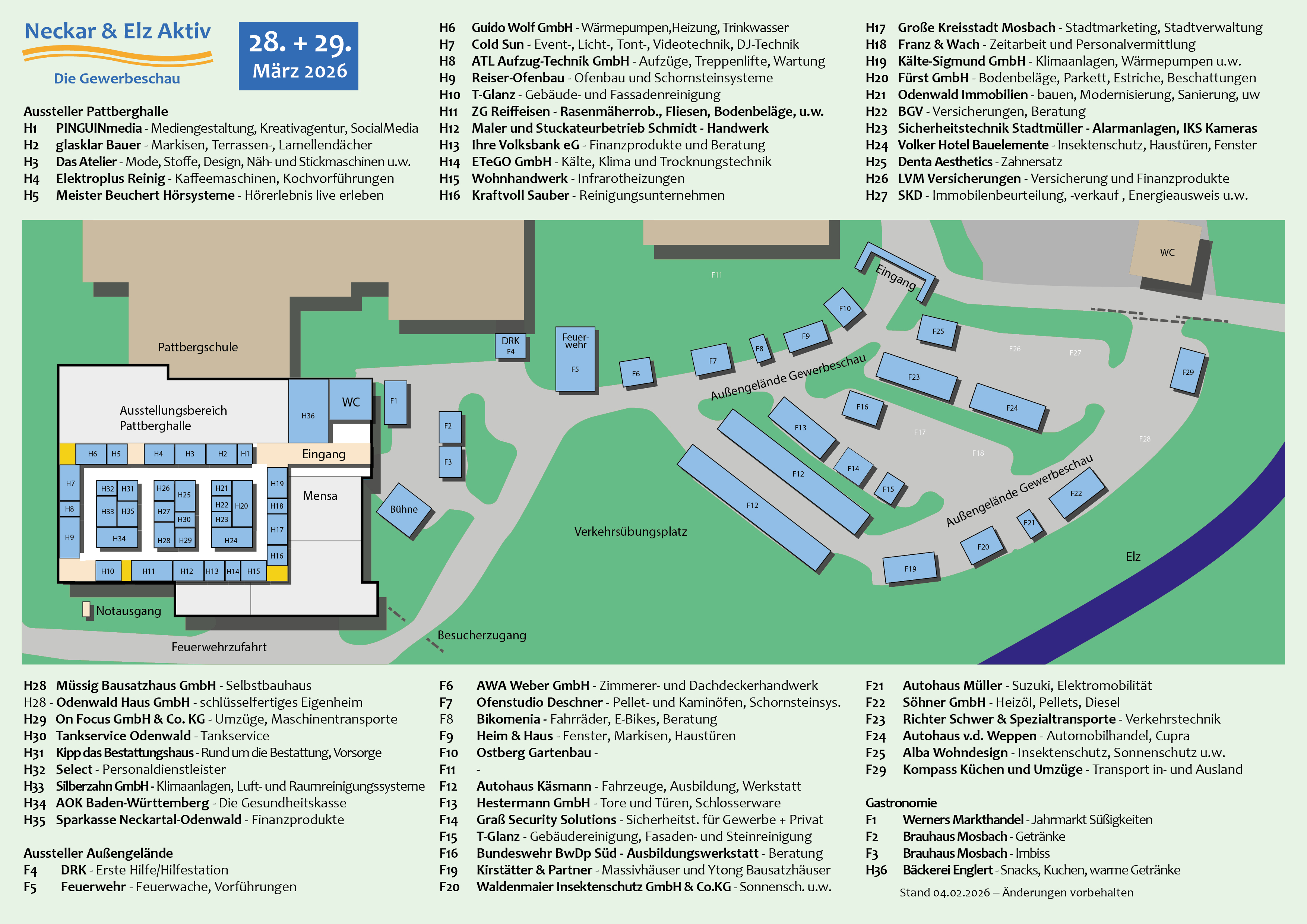 Die Messe für das Gebiet Neckar und Elz, präsentiert sich mit Ausstellern aus der Umgebung, die in und um die Pattberghalle in Mosbach-Neckarelz ihre Produkte und Dienstleistungen präsentieren.