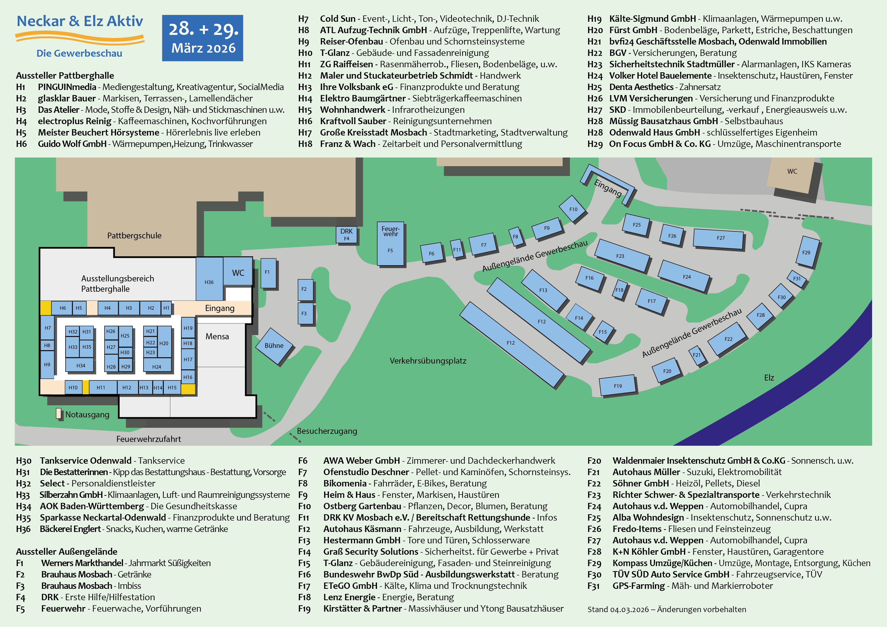 Die Messe für das Gebiet Neckar und Elz, präsentiert sich mit Ausstellern aus der Umgebung, die in und um die Pattberghalle in Mosbach-Neckarelz ihre Produkte und Dienstleistungen präsentieren.
